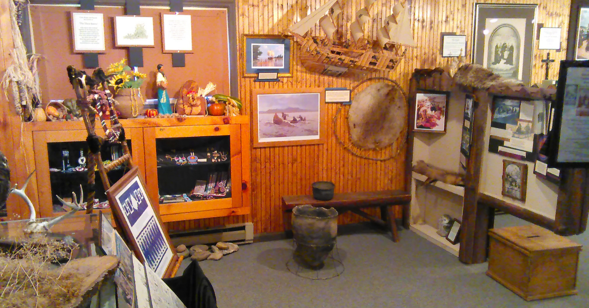 Exhibits in the Mohawk venue include bone and stone tools and weapons, colorful beadwork, and items used in religious ceremonies. Pilgrims can pet the animal pelts and wrap themselves in deerskins. They hold the sweet grass baskets and wampum shell beads; they crush the white sage in their hands and inhale its aroma. They pat the birch bark canoes, beat the drums, and lift the weighty stone tomahawk.